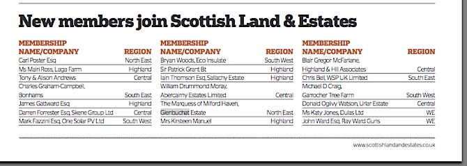 In the Autumn 2013 edition of Land Business, the magazine of Scottish Land and Estates, The Marquess of Milford Haven, Glenbuchat Estate is noted as a new member.