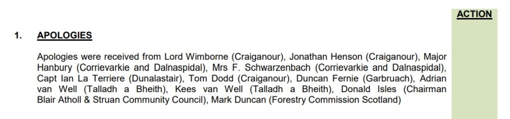 Ivor Mervyn Vigors Guest has, since 1993, been the fourth, and current, Viscount Wimbourne. He is also the fourth Baron Ashby St Ledgers. We might also note in passing the presence at the meeting of Mrs F. Schwarzenbach, the wife of Mr Urs Schwarzenbach the Swiss financier representing Craiganour’s northern neighbour Corrievarkie and Dalnaspidal Estate but that’s for another blog post.