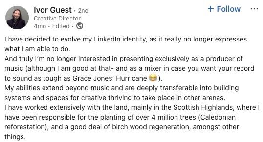 In a recent post (November 2025) he claims to have been “responsible for the planting of over 4 million trees (Caledonian reforestation), and a good deal of birch wood regeneration”.