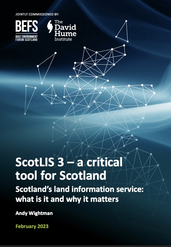![]() | February 2023 ScotLIS 3 – a critical tool for Scotland A report commissioned by Built Environment Forum Scotland and the David Hume Institute reviewing the history of Scotland’s promised land information service. Download Blog post at David Hume Institute Webinar here |